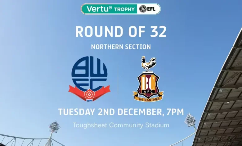 Wanderers will host Bradford City on December 2nd for the Vertu Trophy Round of 32. The match is set to kick off at 7:00 PM. Initially, only the Lower Tier of the Eventura Nat Lofthouse (East) Stand will be open for home fans. Additional seating may be made available depending on ticket demand.