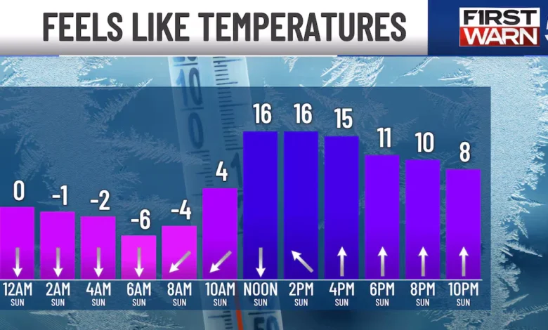 This Sunday morning, expect “feels like” temperatures below 0°F in many areas. In the northern suburbs, wind chill could drop as low as -15°F.