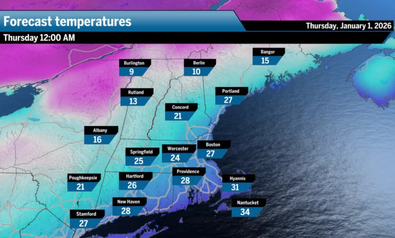 If you’re making plans for outdoor activities as the clock strikes midnight, expect temperatures in the 20s throughout Southern New England. Overcast skies and isolated snow showers may occur, contributing to the wintery ambiance.