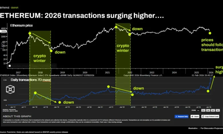 As of February 1, 2026, data reveals Bitmine Immersion Technologies, Inc.’s crypto holdings total an impressive $10.7 billion, comprised of 4,285,125 ETH priced at $2,317 per unit, 193 BTC, alongside significant stakes in Beast Industries and Eightco Holdings, and $586 million in cash reserves. Despite a dramatic drop in Ethereum (ETH) prices from around $3,000 to $2,300, on-chain metrics paint a contrasting picture, showcasing record transaction volumes and active addresses. This disparity invites examination of external factors impacting the market.