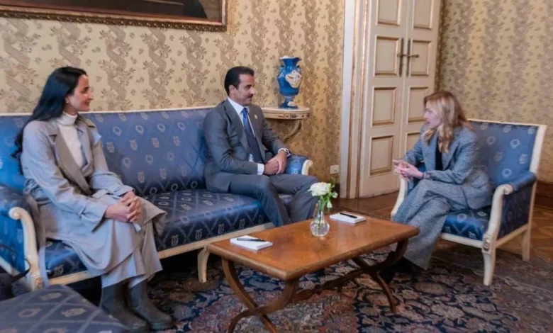 His Highness Sheikh Tamim bin Hamad Al Thani, the Amir of Qatar, engaged in discussions with Italian Prime Minister Giorgia Meloni. This meeting took place at the government palace in Milan as part of the Amir’s visit for the opening of the Milano Cortina 2026 Winter Olympic Games.