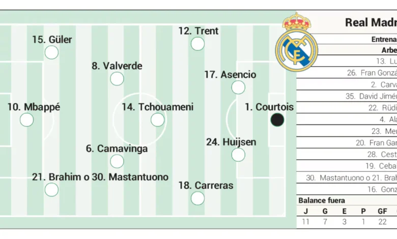 Arbeloa’s strategy may involve significant changes in midfield and the attack. Tchouameni will remain a constant presence, while Valverde and Camavinga return to reinforce the midfield after recent defensive duties. The absence of Vinicius and Rodrygo leads to interesting tactical decisions for the left flank, where either Mastantuono could switch sides or Brahim could step in.