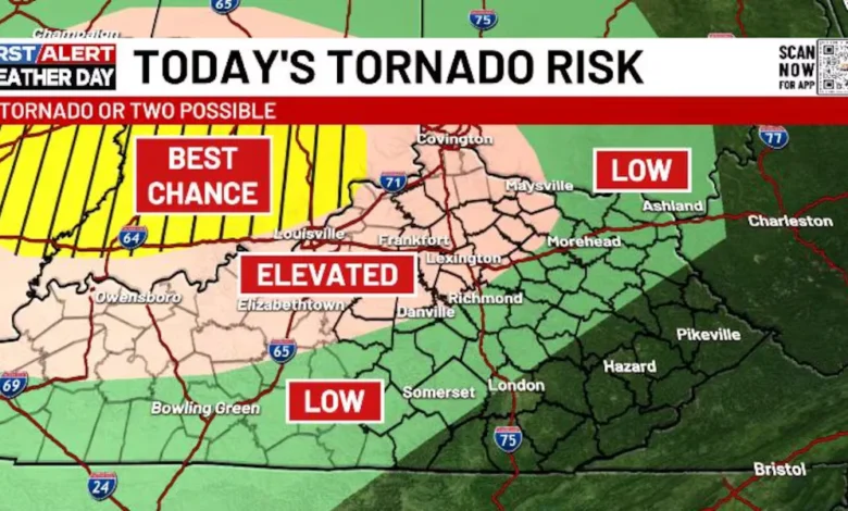 The most significant severe weather threat is expected just north of the Ohio River, impacting southwestern Ohio, Indiana, and Illinois. Conditions are less severe in the southern and eastern parts of Kentucky.
