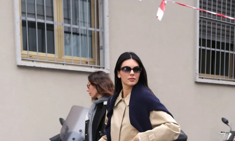 Kendall Jenner embraces a minimalist and elegant look during the fashion week. She was seen in a casual outfit that merges sophistication with comfort. A standout piece was her Burberry Camden car coat in Honey Beige, featuring a single-breasted design cropped to the knee. Underneath, she wore a navy sweater draped over her shoulders, paired with loose white denim jeans and square-toed black leather flats.