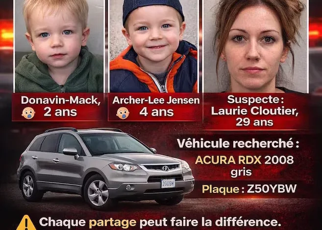Two children, Donavin-Mack, aged 2, and Archer-Lee Jensen, aged 4, were reported abducted in Trois-Rivières. The suspected abductor, Laurie Cloutier, is a 29-year-old woman. The initial report was made on Saturday evening at approximately 9:20 PM.