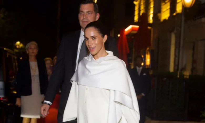 As she left her hotel en route to the show, Markle displayed a refined sense of style. She wore a full Balenciaga ensemble that included a white cape and a silky white button-down shirt. Her look was completed with sleek black pointed pumps and her hair styled in a chic, slicked-back bun.