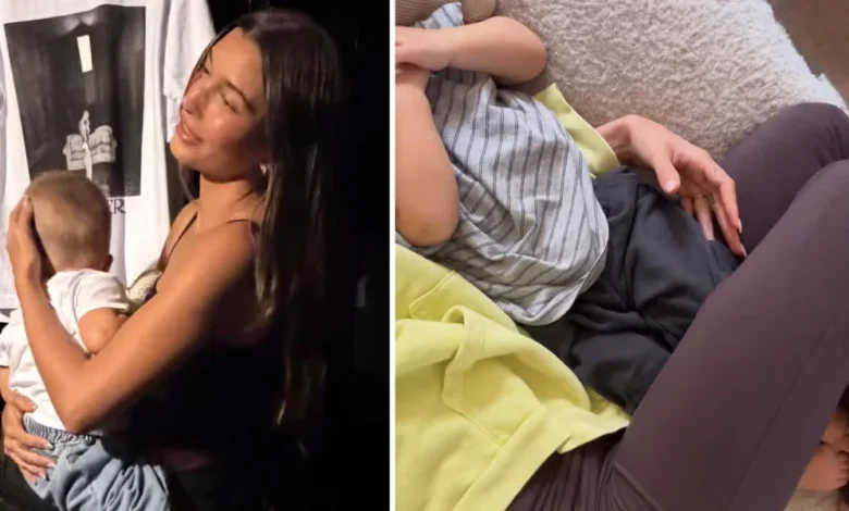 The subsequent images prominently feature her son, Jack. In one touching photo, they cuddle together at a public event. Hailey is dressed in an all-black ensemble, complete with athletic pants and open-toe heels. Another photo captures them relaxed on the couch, where Hailey wears brown leggings and a cozy green hoodie while Jack sports a striped shirt and gray sweats.