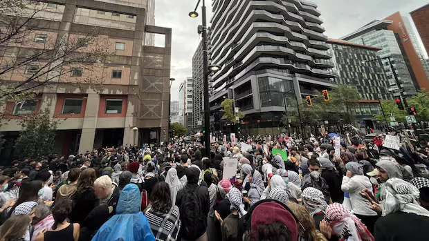 A significant pro-Palestinian protest occurred outside Concordia University’s Henry F. Hall building in downtown Montreal. The event was anticipated, prompting the university to suspend operations for the day. As the clock struck 1 p.m., many attendees, some adorned in keffiyehs, gathered at the intersection of Mackay Street and de Maisonneuve Boulevard.