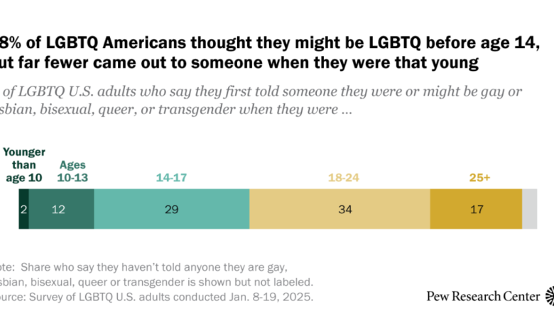 The survey also noted that approximately 8% of U.S. adults identify as LGBTQ. This analysis provides a comprehensive look at the experiences of this population, focusing on when individuals first recognized their identities and the acceptance they felt from those around them.