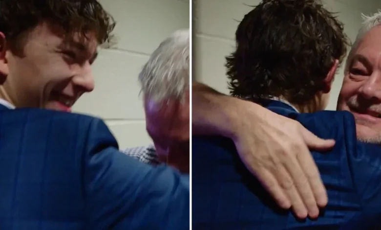 “I didn’t know we had a chess board here too,” Schaefer joked, referring to his father’s checkered shirt, showcasing the close and humorous relationship between the two. This lighthearted exchange highlights the joy and support within Schaefer’s family as he embarks on his professional hockey career.