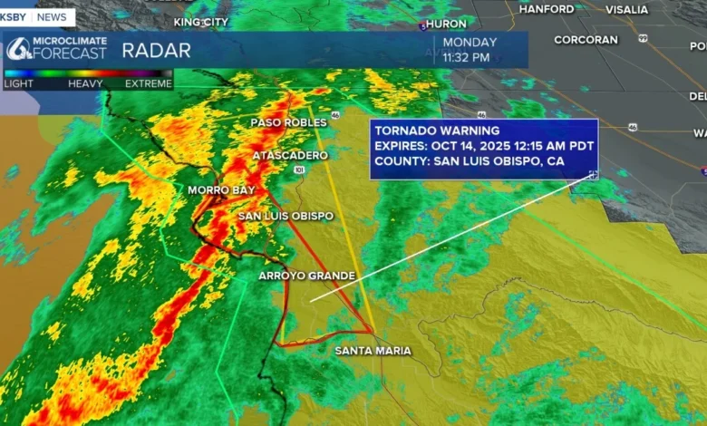 • A tornado warning in effect for parts of San Luis Obispo County, including Cayucos, Morro Bay, and Pismo Beach, until 12:15 a.m.
