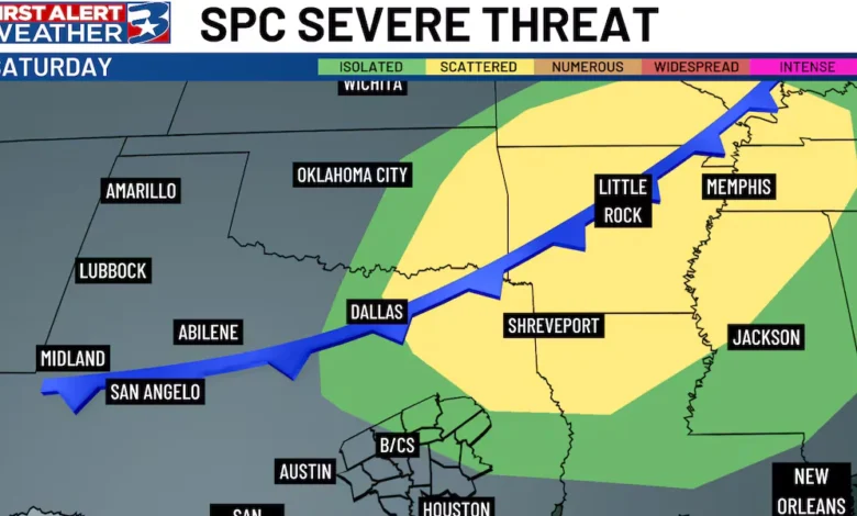 The Storm Prediction Center has categorized the risk of severe storms in the Ark-La-Tex region as slight (a 2 out of 5 risk). There’s also a marginal (1 out of 5) risk extending into more of the Brazos Valley, especially along and east of Interstate 45. Strong storms may emerge ahead of the cold front, utilizing available storm fuel.