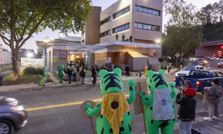 Following this large demonstration, several hundred individuals gathered at the U.S. Immigration and Customs Enforcement (ICE) facility for a nighttime protest. Although this gathering included minor instances of violence, such as the use of tear gas by federal agents and small fires ignited by canisters, rain helped extinguish the flames quickly.