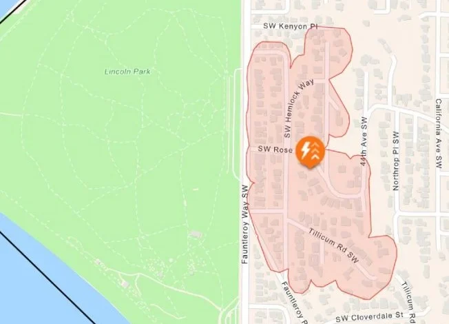 The windstorm in West Seattle has caused significant disturbances, with power outages affecting numerous homes and road blockages due to fallen trees. The first notable incident occurred near the intersection of 45th SW and SW Hemlock, just a couple of blocks from Lincoln Park. According to reports, 117 homes are currently without power.