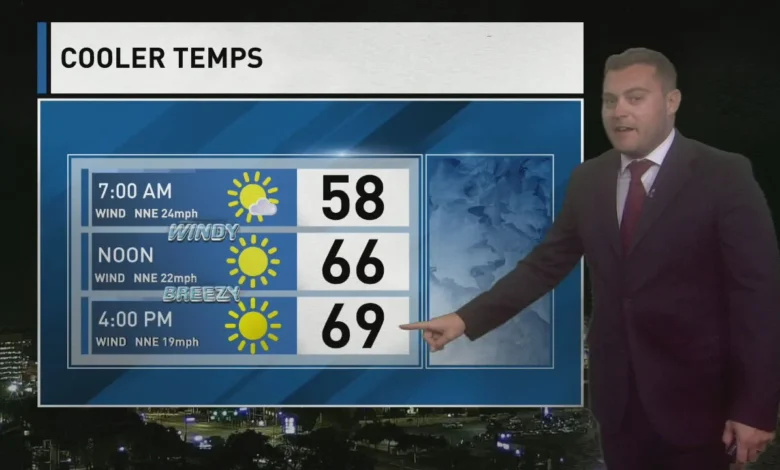 This morning through early afternoon, expect very windy conditions. Winds will begin to diminish by sunset, shifting to a steady breeze later in the day. Despite full sunshine, temperatures will struggle to rise, remaining in the upper 60s to near 70 degrees Fahrenheit.